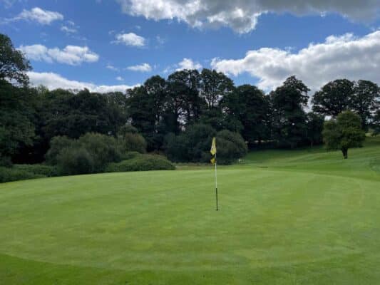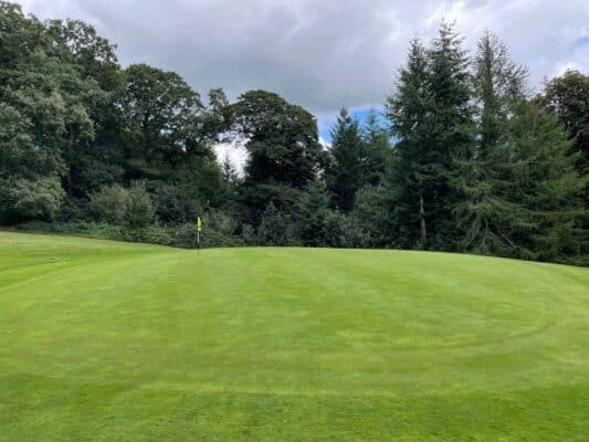 The green slopes gently from back to front and is relatively flat compared to other greens on the course. That said, it is one of the bigger greens at Coollattin.